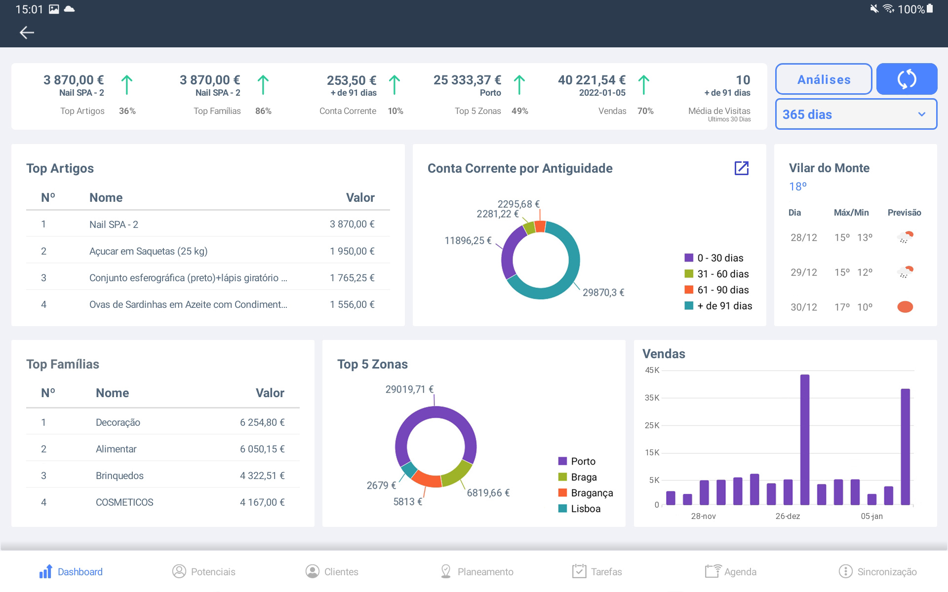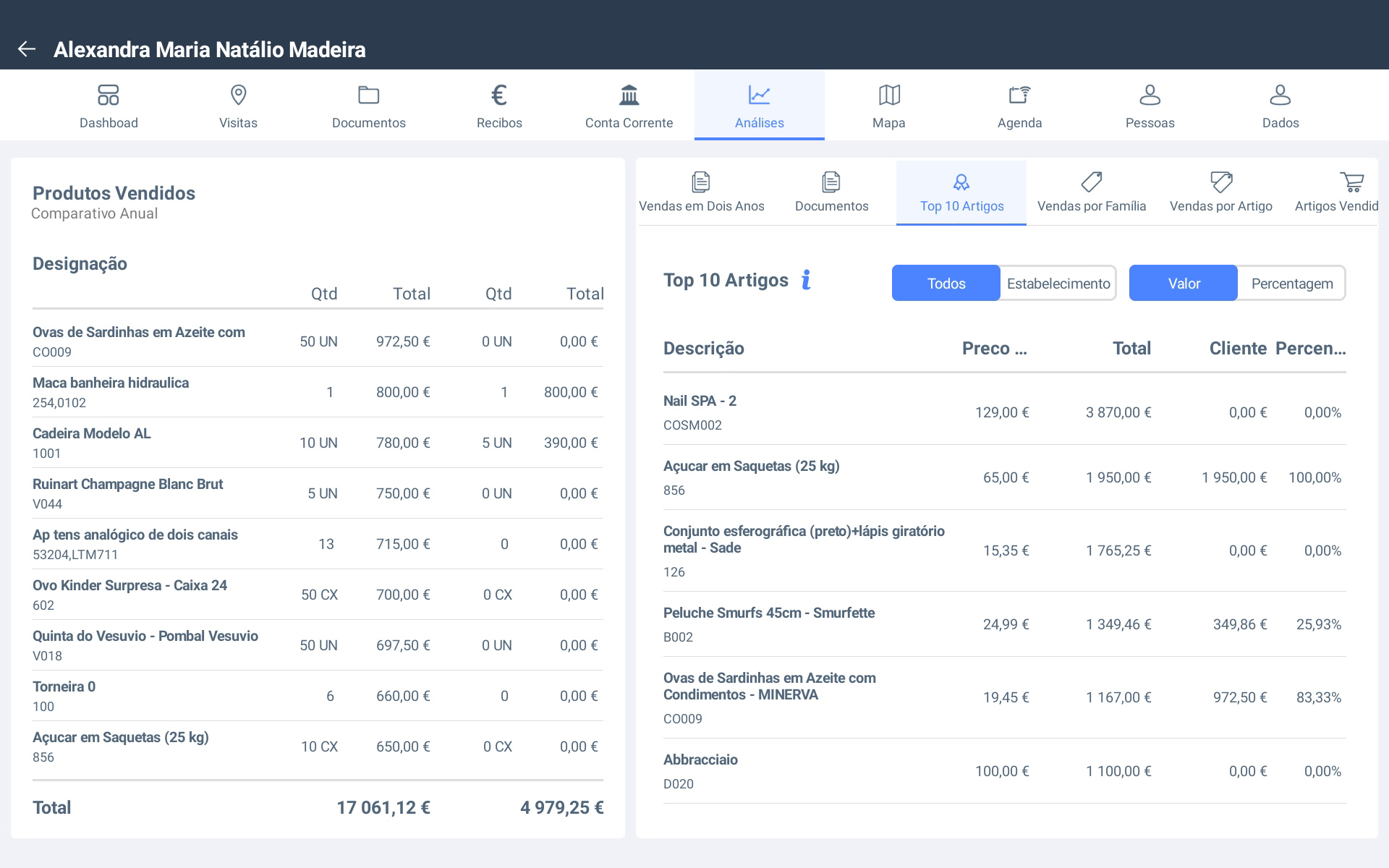 As análises elevam o detalhe da informação que obteve no Dashboard, aqui consegue aprimorar as vendas por artigo em quantidade ou valor e comparar as evoluções homólogas de artigos ou famílias.
